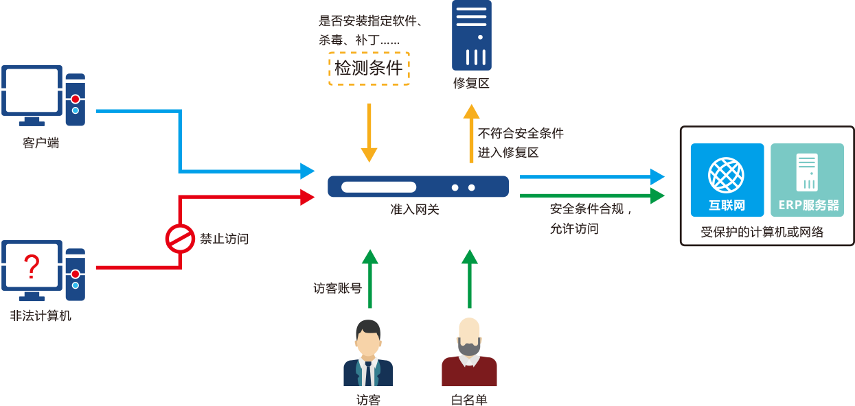 計(jì)算(suàn)機接入企業內(nèi)部網絡對服務器(qì)、互聯網等訪問時(shí),需要經過準入網關嚴格的審核,隻有(yǒu)合法的計(jì)算(suàn)機才能連入訪問,非法計(jì)算(suàn)機可(kě)根據需要将其引導至隔離區(qū)進行(xíng)修複,或者完全阻斷其訪問。